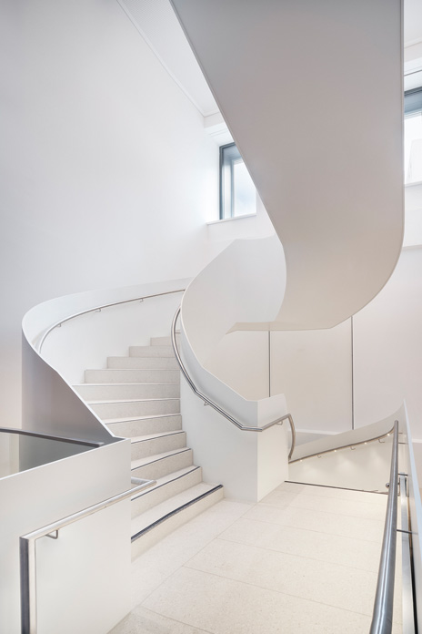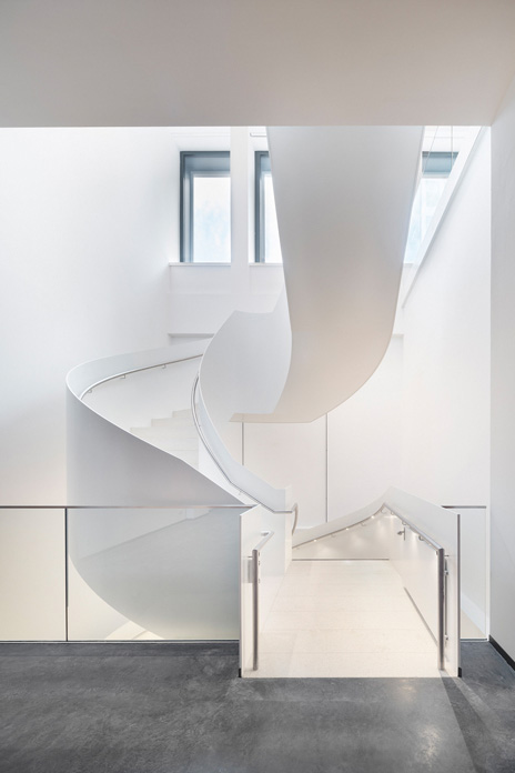 Im Bestand waren, wie im Erdgeschoss, große Raumhöhen vorhanden. Die Treppen sollten jedoch freitragend ausgeführt werden, um möglichst skulptural zu wirken.