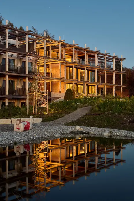 Mit dieser Attitüde fügt sich Treppe auch harmonisch in die Gesamtarchitektur des Hotels: Wie die Treppe im Inneren, wirkt der Bau von außen WOW. Und macht neugierig. Und zwar nicht, weil die Architektur besonders futuristisch ist. Sondern schlicht. Geradlinig. Und aus dem Material, mit dem die Region natürlich verbunden ist: Holz. Genau damit scheint das Hotel den Zahn der Zeit getroffen zu haben: Es ist als einziges Hotel Deutschlands für den Hoteldesign-Award 2024 nominiert. Was für eine Aussicht!