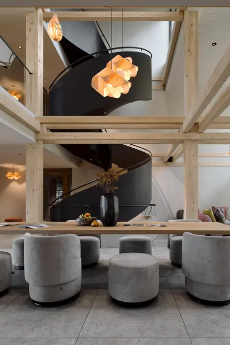 Der Antritt der Treppe in der Lobby gibt den Blick frei auf den Tölzer Wald. Einige Stufen höher: freie Sicht, Blick auf die Berge. „Dieses Wechselspiel zwischen Wald und Bergen ermöglicht ein Verschmelzen mit dem Ort im Hier und Jetzt“, so der ausführende Architekt Sebastian Beham. Achtsamkeit passiert auf dieser Treppe quasi en passant, durch das Begehen nach oben Richtung Roof-Top-Bar, und nach unten in die Lobby.