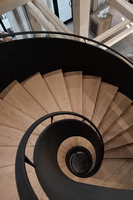 Zum anderen erzeugen die Details der Treppe ein ganz besonders wertiges Miteinander. Wie zum Beispiel die erdige Farbgebung. Oder die Halterungen für den Handlauf, die konisch zulaufen, und dadurch eine gewisse Dynamik erzeugen. Und natürlich der Holzbelag für die Stufen aus Stahl, der der Treppe Wärme und Gemütlichkeit verleiht. Dabei ist sie – das wissen alle, die auf ihr einmal bis nach oben gewandelt sind – vor allem: spannend.